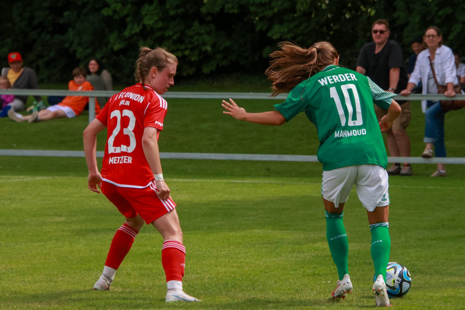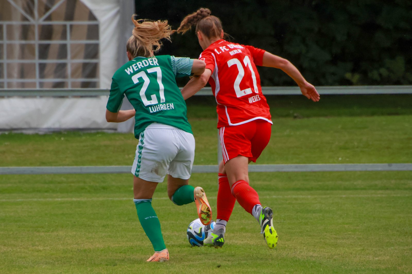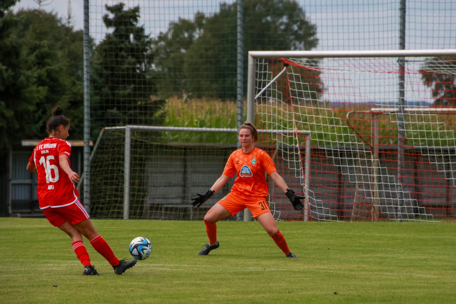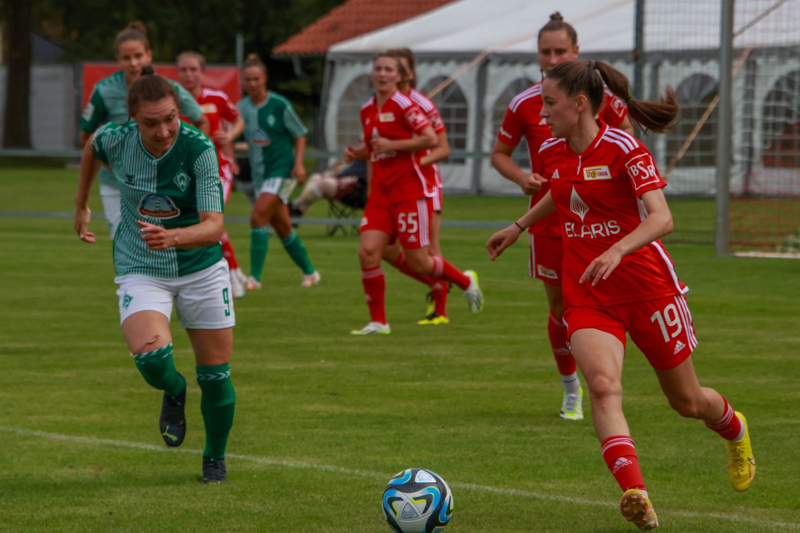 In der 29. Minute zeigte dann der Bundesligist auch seine Qualitäten und überspielte mit einem Pass in die Tiefe die Abwehrreihe der Unionerinnen. Sophie Weidauer hatte zu viel Platz im Strafraum und konnte mit einem trockenen Abschluss ins lange Eck für Werder Bremen verkürzen. Der Anschlusstreffer gab der Mannschaft von Trainer Thomas Horsch mehr Sicherheit und die Grün-Weißen konnten sich nun häufiger aus dem Pressing von Union lösen.