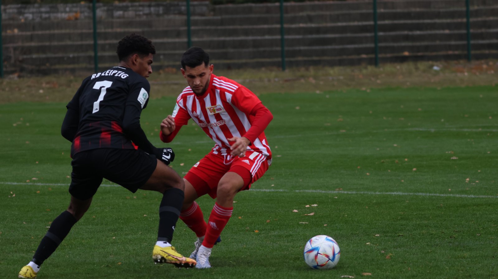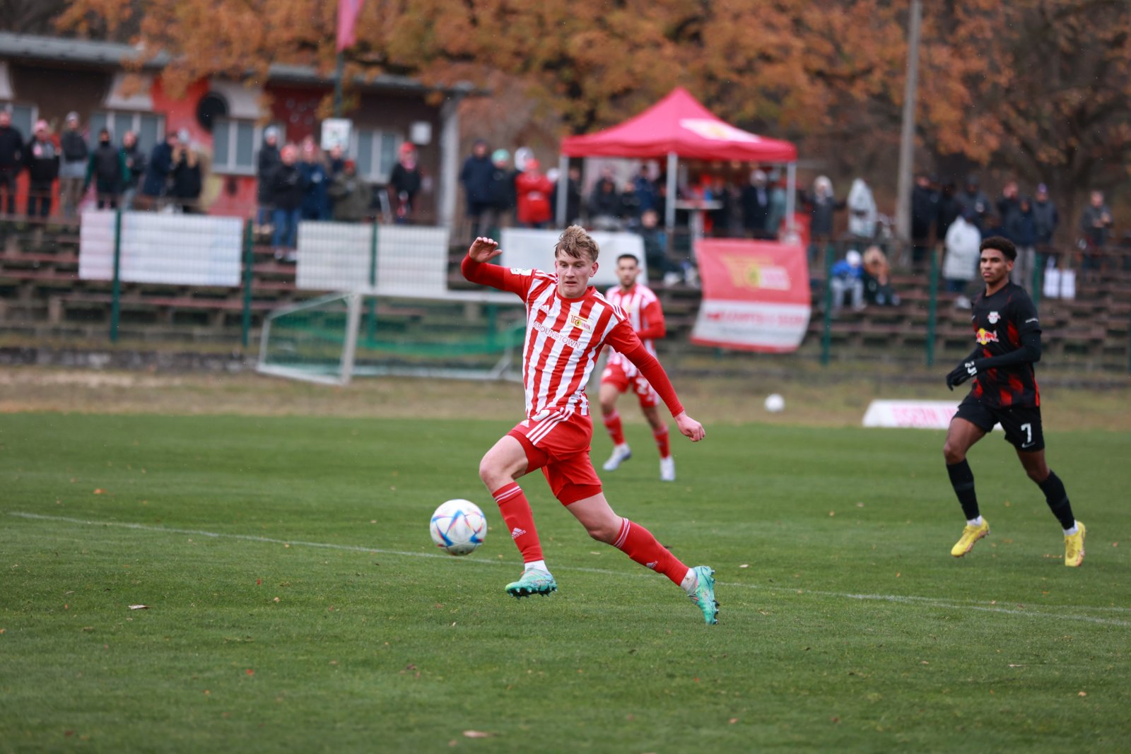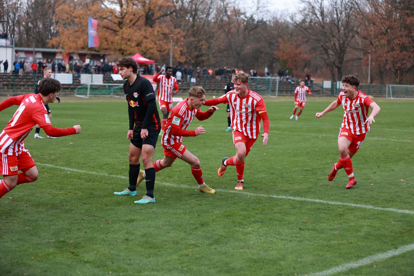 Im Anschluss entwickelte sich ein offener Schlagabtausch. Zunächst hatten die Eisernen eine Chance durch einen Freistoß aus 20 Metern, der in der gegnerischen Mauer landete. Dann versuchten es die Leipziger mit einem Fernschuss, den Keeper Stein entschärfen konnte. Nach einer guten halben Stunde kombinierten sich die Berliner dann in eine Drei-gegen-drei-Situation vor dem Leipziger Tor. Aliji initiierte die Aktion, passte dann rechts raus auf Preu, dessen Schuss im letzten Moment geblockt wurde. Auch die anschließende Ecke war gefährlich und bot den Unionern nochmals eine Doppelchance zur Führung. Diese sicherten sich dann mit dem nächsten Angriff die Leipziger. Eine schnelle Kombination durch das Zentrum eröffnete einem Spieler halbrechts im Strafraum Platz, den er nutzte, um den Ball nochmals quer zu legen. So fand er am langen Pfosten einen Mitspieler, der das Spielgerät nur noch einschieben musste.