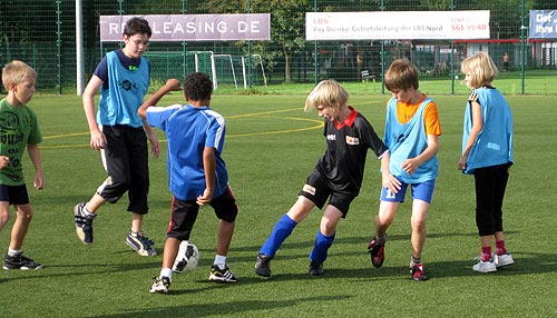 In der ersten Schulwoche, vom 24.08. - 27.08.2010, hatten über 150 Kinder der Edison Grundschule (4.- 6. Klasse) noch Schonfrist. Ihre Projektwoche zur Teambildung und Förderung der sozialen Kompetenzen führte sie an verschiedene Orte in Berlin-Köpenick. Dort konnten sie sich in einer Vielzahl an sportlichen Angeboten erproben. Dazu zählten u.a. Skaten, Boxen, Tennis und auf den Kunstrasenplätzen unserer Jugend natürlich Fußball. Unter Anleitung von Willy (dem Co-Trainer der U 13), Andy, Bea, Patti und Sterni durchliefen sie jeweils 3 Trainingsstationen und konnten ihre Geschicklichkeit am und mit dem Ball unter Beweis stellen.