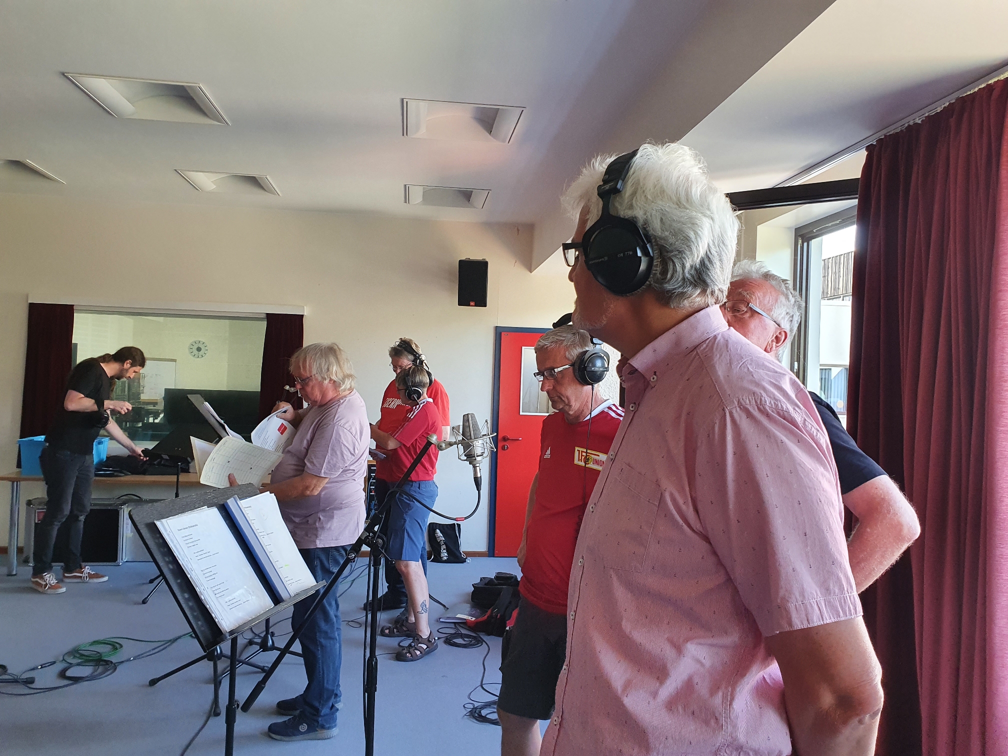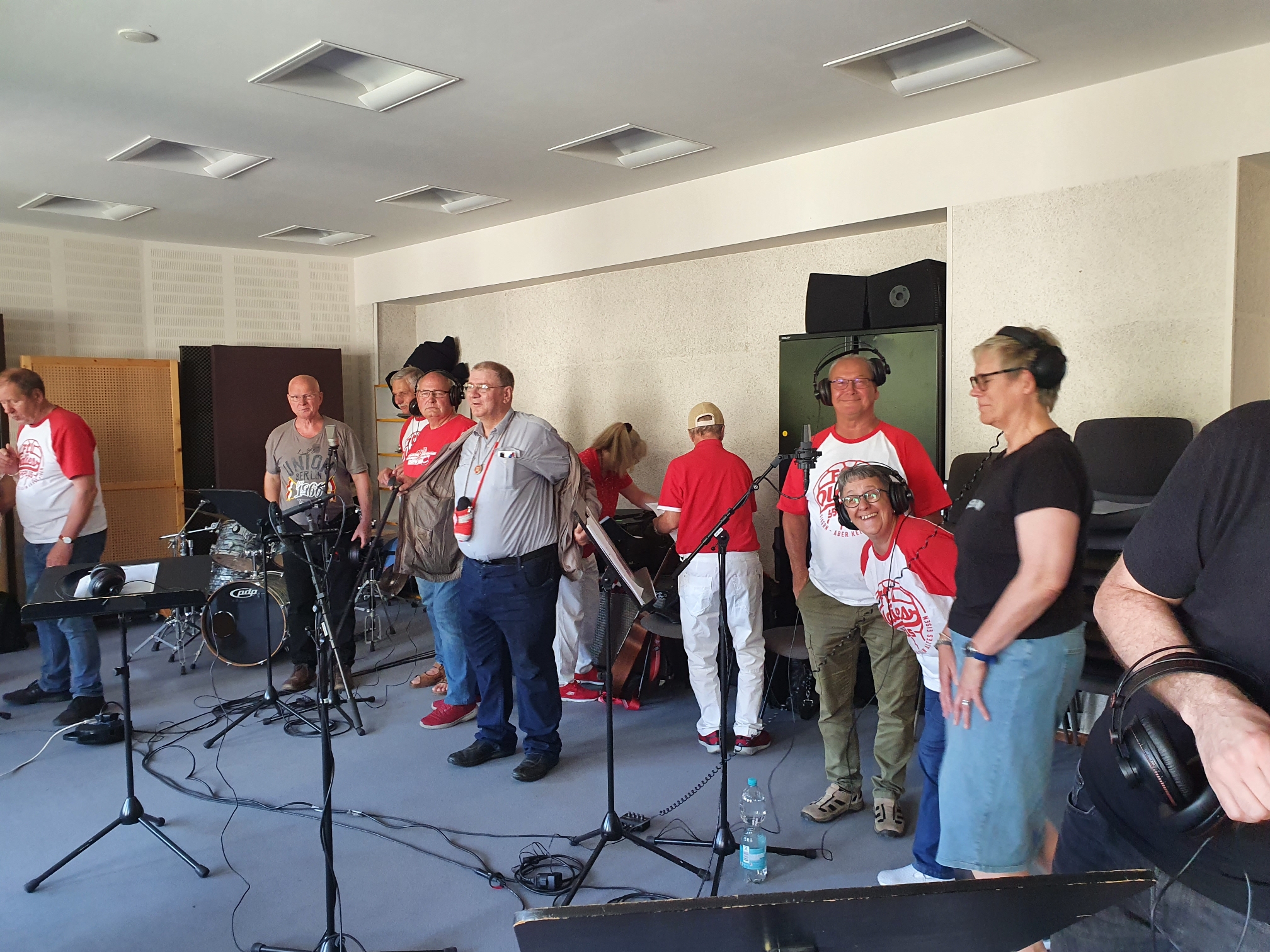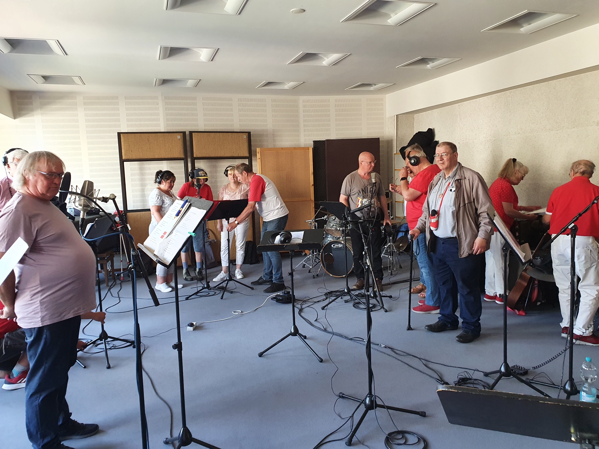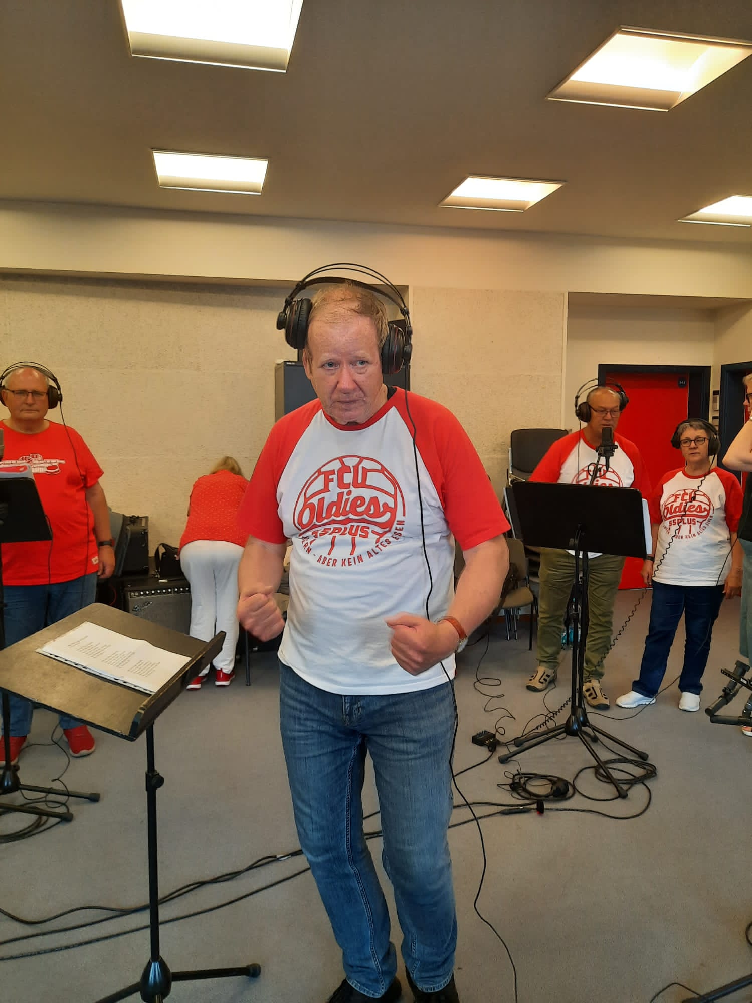 Der Oldie-Chor ging zu ersten Aufnahmen ins Tonstudio der Landesmusikakademie im FEZ. Die Aufregung war greifbar und die Vorbereitung in den letzten Wochen sollte sich lohnen. Zwei Union-Lieder und ein Volkslied sollten es werden. Professionell geführt durch Chorleiter Thomas Lange und technisch begleitet durch den Studioleiter Benjamin Ostarek hatte man sich vorgenommen, drei Lieder als ein erstes “Abenteuer” auf die “Scheibe” zu bringen (Union-Lied von 1966, „100 Jahre Alte Försterei“ – eine Eigenkreation und das Volkslied „Hab mein Wage vollgelade“). Es wurde tatsächlich geschafft! Nach rund zweieinhalb Stunden hieß es, “Aufnahme gestorben” und alle waren mächtig stolz und auch ein bisschen erschöpft von der doch sehr konzentrierten Arbeit im Studio. An alle Beteiligten ein großes Dankeschön für die tolle Leistung!