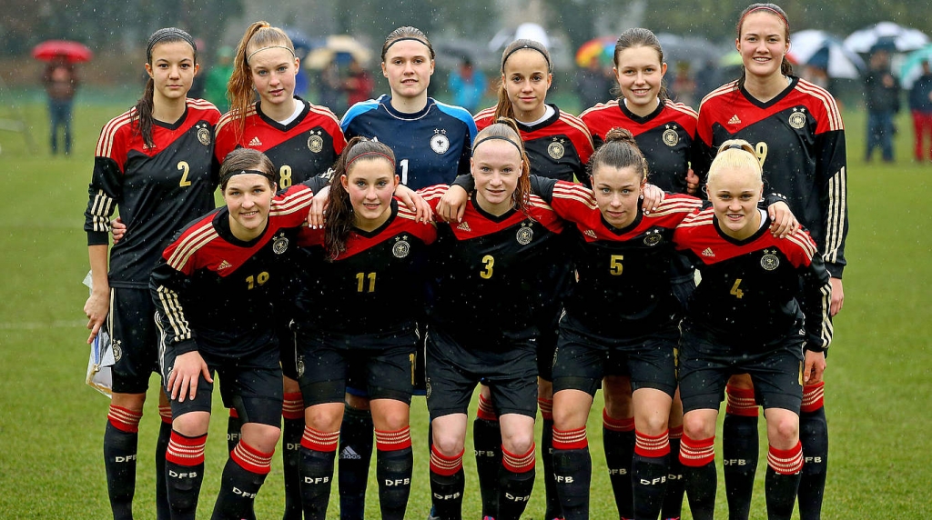 Unionerin Dina Orschmann (Foto: vordere Reihe ganz links) war in der ersten Halbzeit Sturmpartnerin von Stefanie Sanders (SV Werder Bremen). Am 18. April treffen die beiden dann im direkten Punktspiel-Duell der Juniorinnen Bundesliga in Berlin aufeinander.