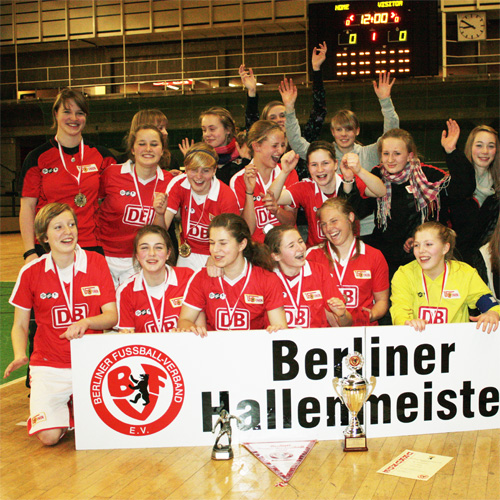 Am vergangenen Sonnabend fand die Hallenmeisterschaftsendrunde des Berliner Fußball-Verbandes der Juniorinnen in der Sömmeringhalle statt. Nachdem bereits im Januar die 1.Frauenmannschaft über den Meistertitel in der Halle jubeln konnte, fuhren auch die U13- und U17-Juniorinnen mit goldenen Medaillen zurück nach Köpenick. Die U15-Juniorinnen belegten den vierten Rang. Neben den mannschaftlichen Erfolgen gab es ebenso zahlreiche Einzelehrungen für die Unionerinnen. Bei den Jüngsten wurde Vivien Pankatz als beste Spielerin und beste Torschützin geehrt. Die U15-Juniorinnen vom 1.FC Union Berlin stellten mit Mimi Menzel die beste Torhüterin des Turniers. Bei den Ältesten wurde Madeleine Wojtecki beste Torschützin. Letztere wird in Duisburg an einem weiteren DFB-Sichtungslehrgang der U16-Nationalmannschaft teilnehmen.