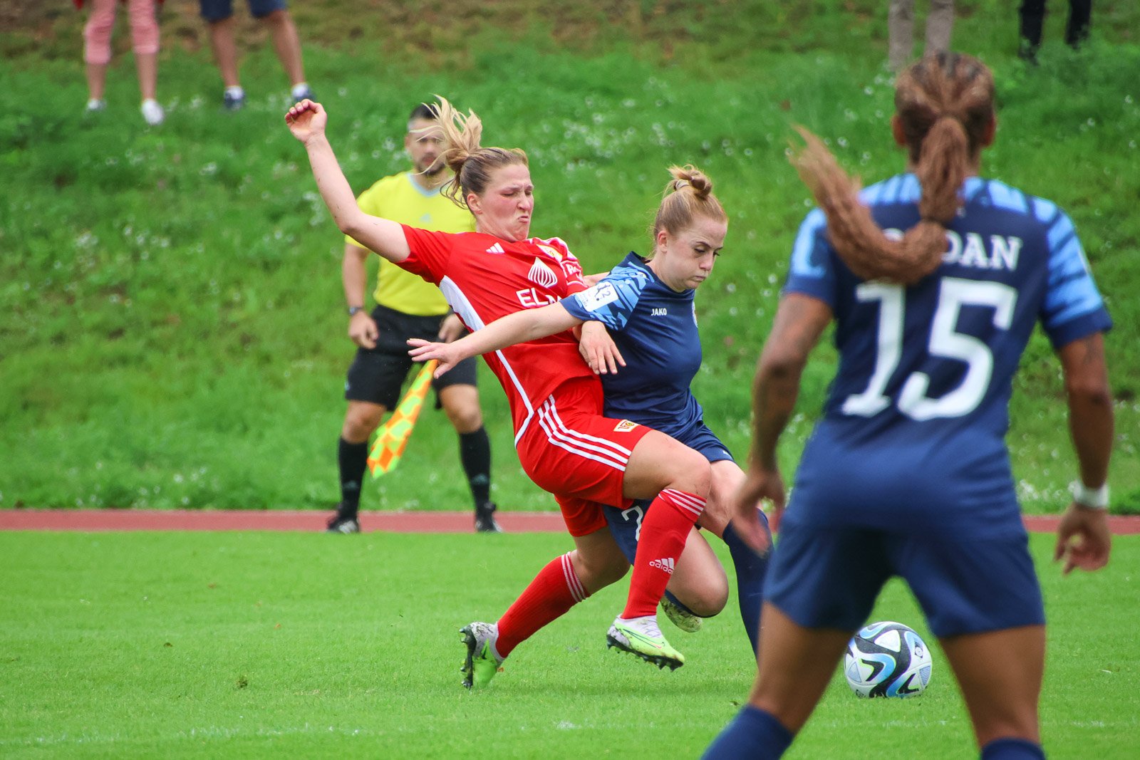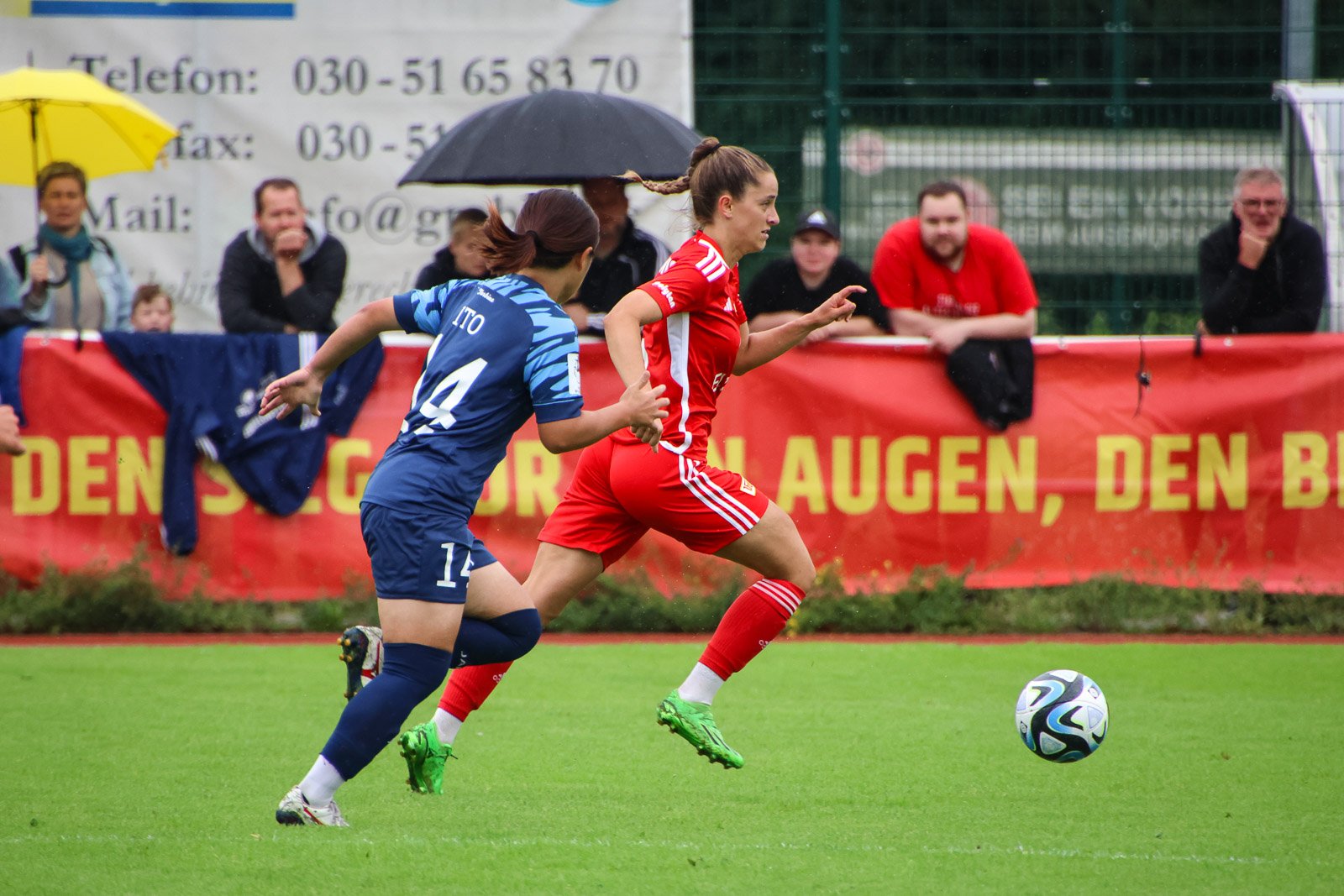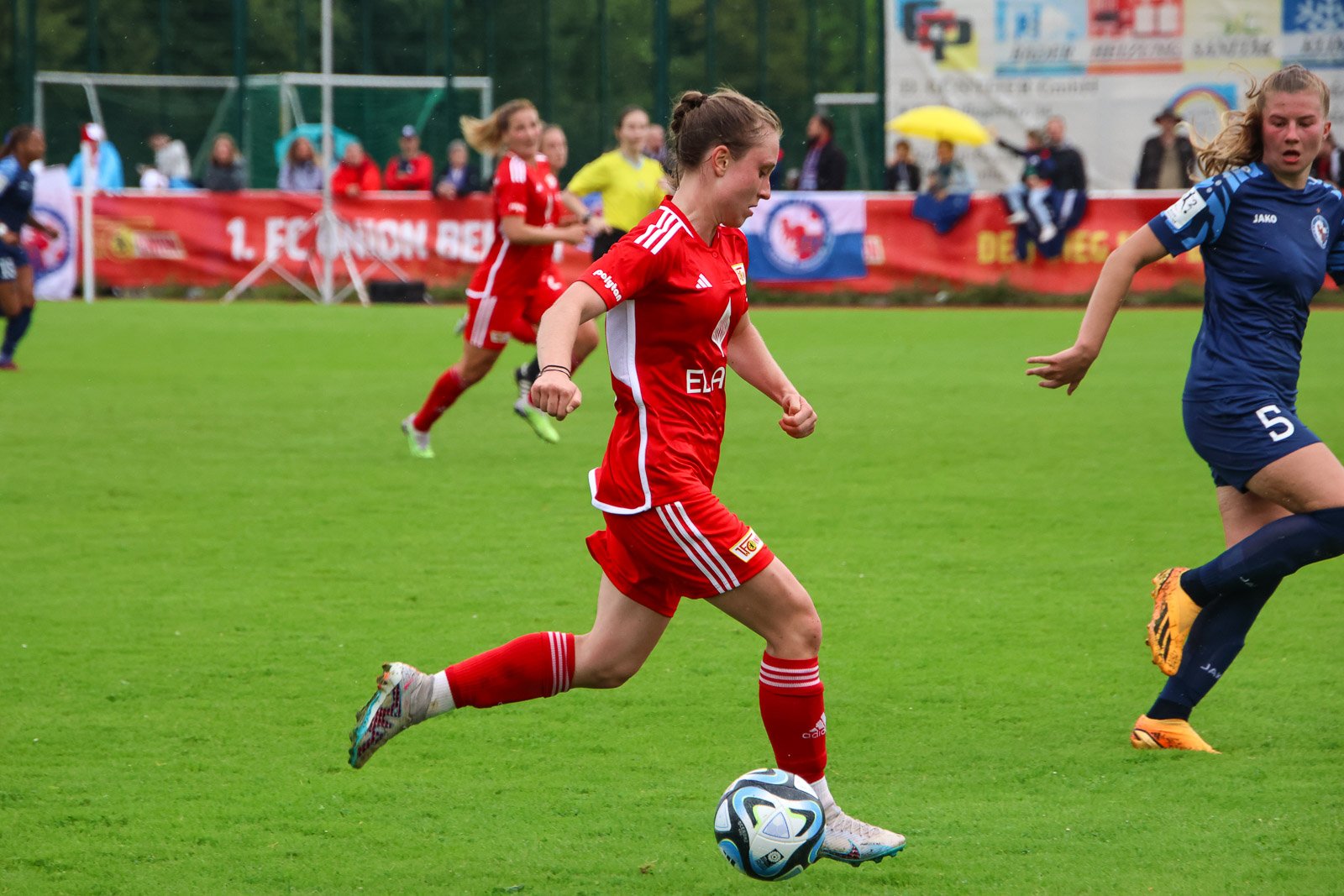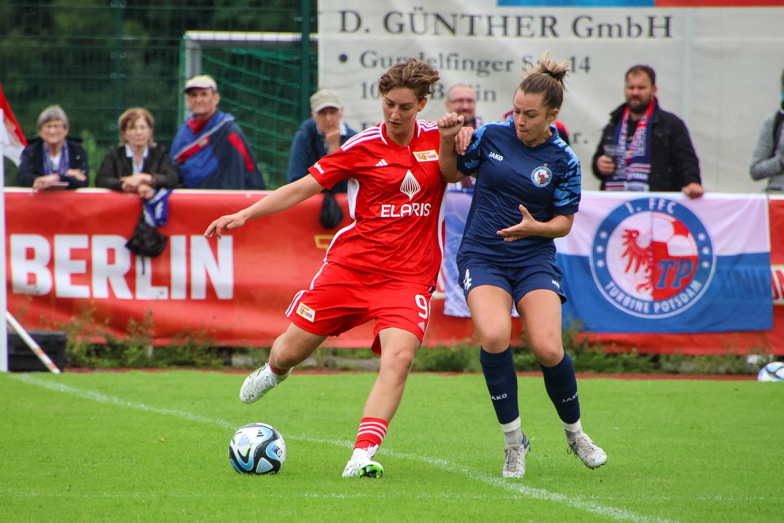 Für die Unionerinnen war es der erste Auftritt in den Heimtrikots für die neue Saison: strahlendes Rot mit dem Logo von Topsponsor und Trikotpartner Elaris. Sportlich präsentierte sich die Mannschaft erstmals in der Saisonvorbereitung in einem anderen Spielsystem und agierte mit einer Dreierkette in der Abwehr. Diese war auch sofort gefordert. Nach nur drei Minuten hatten die Gäste aus Potsdam auf der rechten Seite viel Platz und brachten den Ball flach in den Fünf-Meter-Raum, wo Stürmerin Pauline Deutsch die Kugel an Melanie Wagner vorbei ins Tor spitzelte.