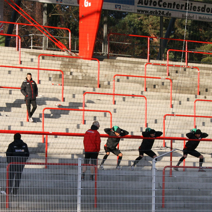 Gut sollten es später alle haben, die sich da ordentlich gestärkt hatten. Das schöne Wetter sorgte nämlich dafür, dass am Nachmittag draußen trainiert wurde. Der sattgrüne Rasen des Stadions An der Alten Försterei diente aber nur als Kulisse und Projektionsfläche für wehmütige Gedanken an Sommer, Sonne und Fußball, denn trainiert wurde auf den Rängen. Zunächst kamen die allseits beliebten Medizinbälle zum Einsatz, anschließend ging es mal wieder treppauf und treppab durch das Stadion. Mit schweren Beinen trabten die Spieler gegen 15:30 Uhr wieder in die Kabine. Zeit zur Regeneration bleibt nicht viel – morgen geht es weiter. Erneut um 9:30 Uhr und um 14 Uhr.