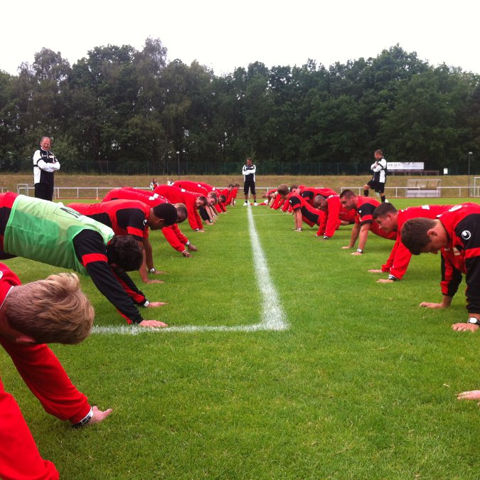 Kein Strandwetter – kein Strand, also ging es heute nach dem Frühstück per Fahrrad ins Stadion und auf die nächsten Laufrunden. Auch die beliebten Stabi-Übungen und verschiedene Geschicklichkeitsspiele standen auf dem Programm und brachten die Truppe sichtlich ins Schwitzen. Da jedoch alle straff mitzogen und das gesamte Programm mit enormem Einsatz absolvierten, wurde als Belohnung schließlich der letzte Lauf erlassen. Ohnehin waren zu diesem Zeitpunkt bereits satte zwei Stunden vergangen, weshalb die Entscheidung sichtbar für Erleichterung auf den Gesichtern der Jungs sorgte.