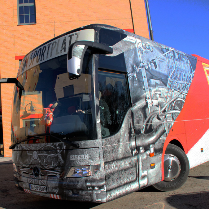 Zukünftig wird das 426 PS starke und mit 28 Plätzen ausgestattete dreiachsige Gefährt vom Typ Mercedes-Benz Tourismo die Profis quer durch Deutschland transportieren. Bei strahlendem Sonnenschein fand am Nachmittag die erste Besichtigung durch die Spieler und Mitarbeiter von Verein und Stadiongesellschaft statt.
