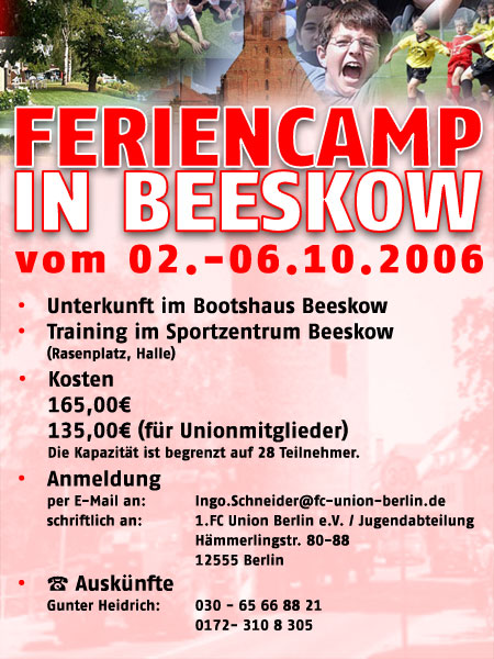 Natürlich. Wir sind diesmal in Beeskow, wo die Unterkunft im Bootshaus ist und wir im dortigen Sportzentrum auf einem Rasenplatz und in der Halle trainieren können. Das Camp dauert vom 2. bis 6. Oktober und wird für die Teilnehmer mit Sicherheit wieder ein Erlebnis. Für Union-Mitglieder kostet das Camp bei voller Verpflegung 135 Euro, Nichtmitglieder können auch dabei sein und zahlen 165 Euro. Die Teilnehmerzahl ist aus Kapazitätsgründen auf 28 beschränkt, Interessenten sollten sich also beeilen. Die Anmeldung kann telefonisch unter 030-65668821 erfolgen.