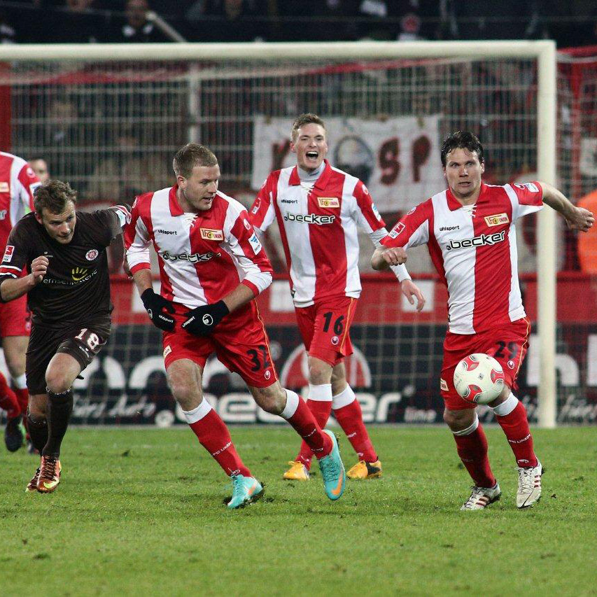 Die Partie erfuhr einen ruhigen Beginn, bei dem Union den Ball zumeist unbedrängt in den eigenen Reihen zirkulieren ließ. Bei St. Pauli fehlte der rotgesperrte Daniel Ginczek. Den Hamburgern schien die Abwesenheit ihres 12-Tore-Stürmers den Offensivdrang geraubt zu haben. Bis auf einen ungenauen Distanzschuss von Fabian Boll lief bei den Gästen in der Anfangsphase wenig zusammen. Auf der anderen Seite hatte Simon Terodde nach Zuspiel von Patrick Kohlmann mit seinem Drehschuss eine erste gute Möglichkeit. Philipp Tschauner lenkte den Versuch jedoch gekonnt um den Pfosten (16.). Vier Minuten später setzte Kapitän Mattuschka Unions besten Torschützen glänzend in Szene. Im Duell mit Pauli-Keeper Tschauner entschied sich Terodde für den Heber, traf und durfte sich über sein neuntes Saisontor freuen. Union hatte das Spiel fest im Griff und kombinierte sich passsicher immer wieder in die gegnerische Hälfte hinein. Zu Torabschlüssen kamen die Köpenicker derweil aber zu selten. Einem verlorenen Zweikampf von Björn Jopek folgte dann eine Flanke von Florian Kringe, welche den zentral postierten Marius Ebbers fand, der nach missglückter Annahme im Nachsetzen doch noch das Tor traf (37.). Noch vor der Halbzeit legte Torsten Mattuschka für die Hausherren nach. Baris Özbek setzte sich zielstrebig bis zur Grundline durch und legte auf den 32-Jährigen zurück. Der Standardspezialist nahm den Ball direkt und setzte das Leder an die Unterkante der Latte, von wo das Spielgerät zur 2:1-Halbzeitführung in den Maschen landete.