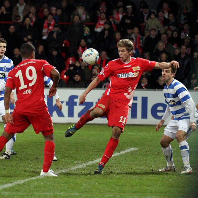 Der in der Heimat unter großem Ergebnisdruck stehende MSV-Trainer Oliver Reck entschied sich gegen Union für die kompakte Variante. Die „Zebras“ begannen mit nur einem Stürmer und setzten auf effiziente Konter über die einzige Spitze, den schnellen Maurice Exslager. Die erste Situation bot sich nach fünf Minuten allerdings Union. Ex-Duisburger Simon Terodde bewegte sich schnellen Schrittes auf das Tor von Felix Wiedwald zu und kam zu Fall. Schiedsrichter Frank Willenborg entschied auf Schwalbe und zeigte dem Stürmer die gelbe Karte. Den Gästen war die Bedeutung des Spiels anfangs anzumerken. Besonderes Risiko gingen die Meidericher nicht und so nutzte Union die Räume zur ersten großen Chance. Torsten Mattuschka schlug eine Ecke auf Patrick Kohlmann, der auf Höhe des zweiten Pfostens zwei Meter vor dem Strafraum lauerte. Der Deutsch-Ire nahm den Ball elegant an, schoss und fand krachend nur das Quergestänge (12.). Doch einen echten Vorteil konnte sich in den folgenden Minuten keines der beiden Teams erarbeiten. Vielmehr boten sich die Kontrahenten taktisch und spielerisch ein Gefecht auf Augenhöhe. Als Konsequenz boten sich den Zuschauern kaum Strafraumszenen noch nennenswerte Torgelegenheiten. Dann bekam Jan Glinker Gelegenheit sich auszuzeichnen. Maurice Exslager stibitzte einen Fehlpass von Kapitän Mattuschka und brachte das Spielgerät aus spitzem Winkel aufs Gehäuse, aber Glinker war zur Stelle und parierte das Geschoss (37.). Kurz darauf klärte Christoph Menz in letzter Sekunde vor Exslager, der von Daniel Brosinski gefährlich in Position gebracht wurde. Torlos ging es in die Pause.