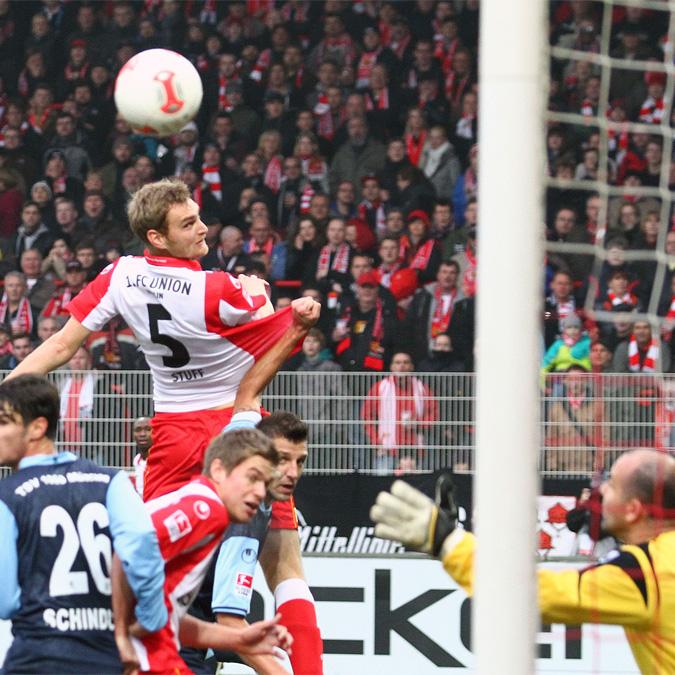 Regennasser Rasen verlangte allen Aktiven hohe Aufmerksamkeit ab. Besser mit den herbstlichen Gegebenheiten kam zunächst Union zurecht, von Anpassungsproblemen keine Spur. Torsten Mattuschkas scharfe Freistoßflanke fand Michael Parensen, der das Spielgerät zwar nur Zentimeter neben das Aluminium setzte, dabei aber auch im Abseits stand (5.). Nur mit Verzögerung bekamen die Löwen bei Ballverlust Ordnung in ihre Reihen. Dies nutzten die Gastgeber für erste gefährliche Tempodribblings über die Außenpositionen. Auf wirkliche Torgefahr warteten die 16.750 Zuschauer im ausverkauften Stadion An der Alten Försterei indes bis zur 21. Spielminute. Dann eroberte Kapitän Mattuschka den Ball, schaltete schnell und bediente Simon Terodde, der umgehend den Abschluss suchte. Gabor Kiraly klärte zur Ecke, die, getreten von Torsten Mattuschka, auf dem Kopf des baumlangen Christian Stuff landete. Der Innenverteidiger, der gerade seinen Vertrag um ein Jahr bis 2014 verlängert hatte, schraubte sich in die Höhe und köpfte den Ball gefühlvoll zur Führung in die lange Ecke (21.). 1860 brauchte danach nicht viel Zeit und kam durch den Distanzschuss von Daniel Bierofka zu einer ersten Torchance (25.). Der Hingucker im ersten Abschnitt war unbestritten das Solo von Patrick Zoundi nach gut einer halben Stunde. Der rechte Läufer forderte mit dem Ball am Fuß hintereinander gleich vier Gegenspieler zum Tanz, absolvierte die ihm gestellten Aufgaben mit Bravour, scheiterte dann jedoch beim Torabschluss (31.). Das Spiel verlor in der Folge spürbar an Dynamik, weshalb es mit der für Union verdienten Pausenführung pünktlich in die Kabine ging.