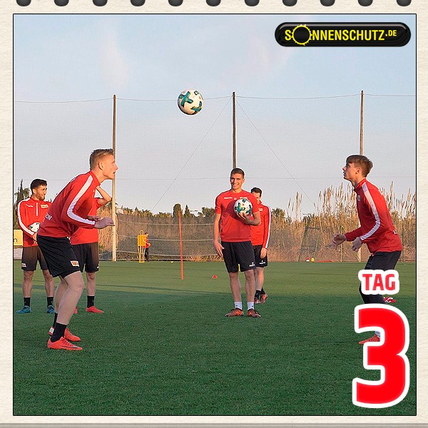 Nach dem Frühstück ging es erneut aufs Feld. Von den Passformen und einigen Dribbling-Wettbewerben – für die Verlierer waren Liegestütze fällig – ging es ins Stabilisierungsprogramm, welches Athletiktrainer Martin Krüger leitete. Wenig später radelten die Union-Profis zurück zum Hotel, stellten ihren fahrbaren Untersatz ab und tauschten Fußballschuhe gegen Handtuch und Badelatschen. Am Strand vor dem Oliva Nova Golf & Beach Resort ging es zur Unterstützung der Regeneration ins kühle Mittelmeer.