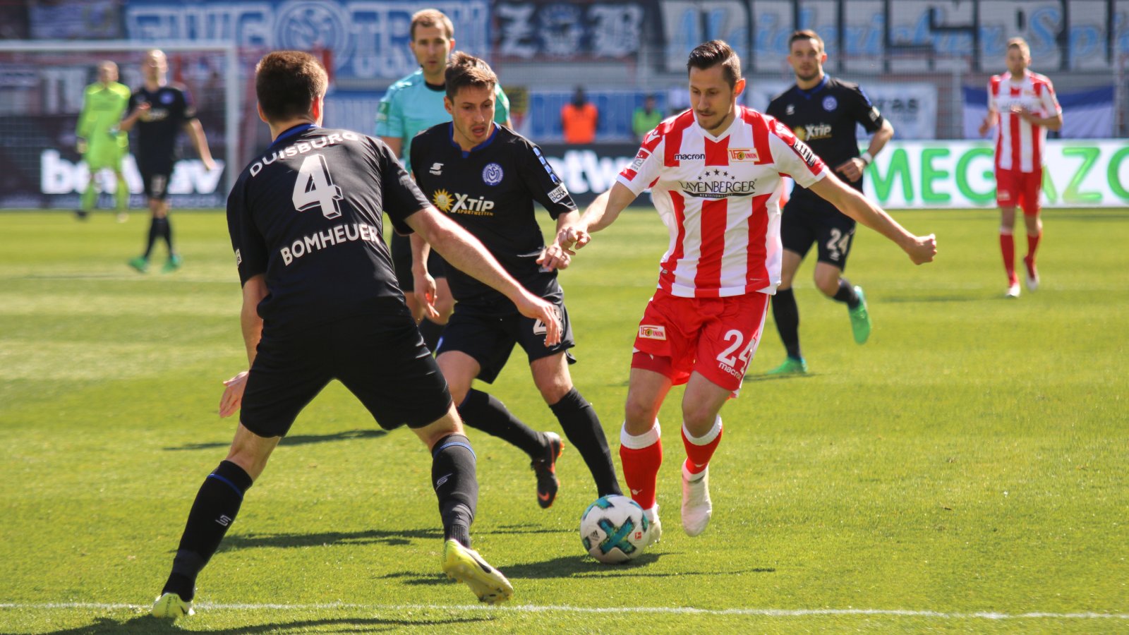 Bei perfekten Bedingungen und strahlendem Sonnenschein starteten beide Mannschaften engagiert in die Partie und zeigten sich in den Zweikämpfen von Beginn an präsent. Aus einer kompakten Defensive kontrollierten die Eisernen mit zunehmender Spielzeit das Geschehen auf dem Rasen und kamen durch Kapitän Felix Kroos in der neunten Spielminute zum ersten Abschluss. MSV-Keeper Mark Flekken stellte der Schuss aus 17 Metern jedoch vor keine größeren Probleme. Die Zebras blieben in der Offensive zurückhaltend, kamen jedoch nach einer Viertelstunde mit einem gut ausgespielten Konter gefährlich vor den Kasten von Jakob Busk. Bedient von Fabian Schnellhardt versuchte Boris Tahchy sein Glück im Strafraum, setzte den Ball jedoch aus guter Position neben den linken Pfosten. Union blieb weiter konzentriert und setzte den MSV mit hohem läuferischem Aufwand unter Druck. Nach einer feinen Spieleröffnung von Leistner brachte der spielfreudige Steven Skrzybski den Ball von der linken Außenbahn gefährlich vor das Tor der Gäste, bedrängt von Verteidiger Wolze verfehlte Philipp Hosiner den Kasten jedoch denkbar knapp. Steven Skrzybski und Dennis Daube versuchten in der Folge ihr Glück aus der zweiten Reihe, zielten jedoch beide deutlich zu hoch. Beide Teams schenkten sich in den Zweikämpfen nichts, immer wieder musste Schiedsrichter Florian Heft das Spielgeschehen unterbrechen. Knapp zehn Minuten vor der Pause setzte Philipp Hosiner nach einer Trimmel-Flanke artistisch zum Fallrückzieher an, Keeper Flekken stand jedoch goldrichtig und parierte den Ball souverän. Bei eigenen Standards verschleppten die Zebras immer wieder das Tempo auf dem Platz, offensiv blieben die Gäste dabei bis zur Pause blass.