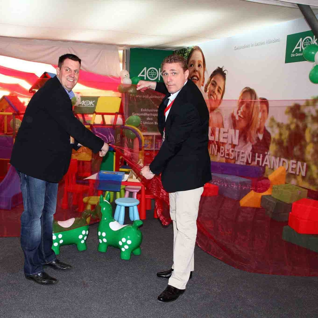 Die AOK-Kinderecke wurde durch Herrn Matthias Auth, den Marketingleiter der AOK Nordost, und Oskar Kosche, Geschäftsführer des 1. FC Union Berlin, feierlich eingeweiht und zum Erkunden freigegeben. Für den Eisernen Nachwuchs gab es viel Neues zu erleben: Kletterburg, Union-Memory, Malecke, und vieles mehr. Die AOK-Spielecke fand sogleich großen Anklang bei den Jung-Unionern. Wir bedanken uns herzlich bei der AOK Nordost für die tolle Unterstützung.