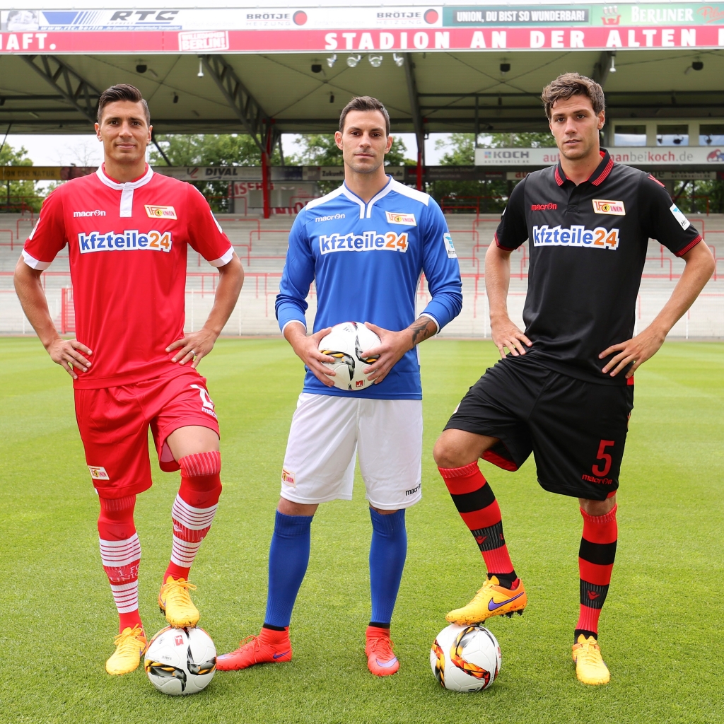 Der 1. FC Union Berlin und Macron haben gemeinsam in Berlin die neuen Heim- und Auswärtstrikots der Eisernen für die Saison 2015/2016 offiziell vorgestellt. Roberto Casolari, Direktor Sports Marketing von Macron, und Nico Schäfer, kaufm.-org. Leiter von Unions Lizenzspielerabteilung präsentierten zusammen mit Union-Kapitän Damir Kreilach, Neuzugang Benjamin Kessel und Torhüter Daniel Haas die Spielkleidung.