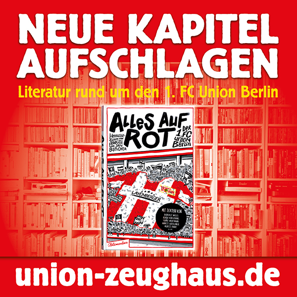 Mit dem Buch „Alles auf Rot“ wird der Union-Bibliothek nun noch ein weiteres Kapitel hinzugefügt: Union-Geschichten, erzählt von namhaften Autoren wie Benedict Wells, Christoph Biermann, Annett Gröschner und Sönke Wortmann – um nur einige zu nennen, deren Namen im Inhaltsverzeichnis auftauchen. Das Buch ist ab sofort in allen Union-Zeughäusern sowie im Buchhandel erhältlich.