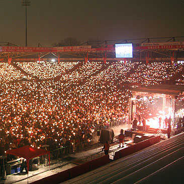 Mit Kerzen und Liederbüchern begrüßt, verteilte man sich bei Glühwein und leckeren Weihnachtsschlemmereien auf den Rängen im weiten Rund und erstmalig auch im Innenraum, auf dem sonst ausschließlich den Profis vorbehaltenen heiligen Rasen. Unterstützt vom Chor des Emmy-Noether-Gymnasiums erlebten die 22.500 Sänger ab 19:00 Uhr den Wohlklang eines in dieser Vielzahl noch nie dagewesenen Weihnachtschores. Die besinnliche Weihnachtsgeschichte, traditionell vorgetragen von Pfarrer Peter Müller, gehörte ebenso zum Repertoire, wie zahlreiche Union-Songs, die Groß und Klein in bester Weihnachtslaune in die bevorstehenden Feiertage entließen.