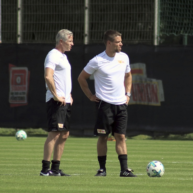 Christoph Liebig, ehemaliger Nachwuchstrainer beim 1. FC Union Berlin und inzwischen Verbandssportlehrer beim Hessischen Fußballverband, stand gemeinsam mit Jens Keller, Henrik Pedersen und Sebastian Bönig auf dem Trainingsplatz. Liebich absolviert derzeit beim DFB die Ausbildung zum Fußballlehrer und hospitiert in den nächsten Wochen beim 1. FC Union Berlin.