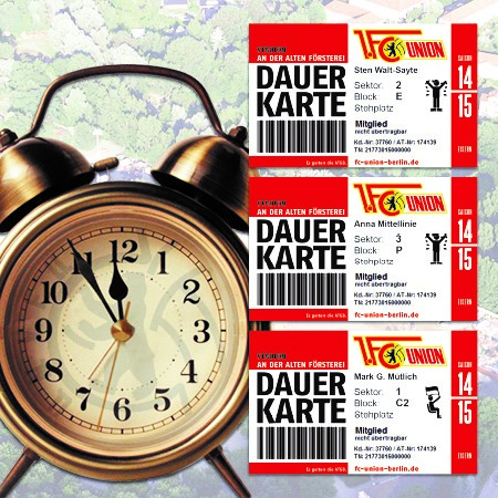 Bares Geld sparen, kein Anstehen an den Tageskassen und das exklusive Vorkaufsrecht für besonders stark nachgefragte Spiele – es spricht alles für die Dauerkarte zu den Heimspielen des 1. FC Union Berlin im Stadion An der Alten Försterei. Detaillierte Informationen zur Dauerkarte und den Eintrittspreisen in der Saison 2014/2015 sind der Homepage zu entnehmen.