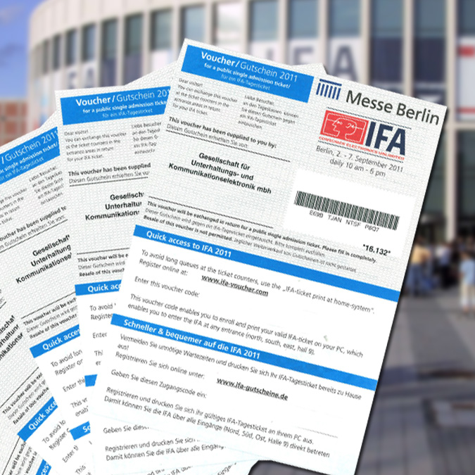 Die IFA-Gutscheine werden an den Tageskassen und an den Eingängen für Karteninhaber ausgegeben. Die Einlösung der Gutscheine erfolgt an den Tageskassen der IFA. Da die Gutscheine jeweils über einen individuellen Code verfügen, können sie auch im print@home-Verfahren am heimischen Rechner gegen ein IFA-Ticket eingelöst werden.