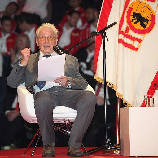 Nach dem formalen Teil der Mitgliederversammlung wurde auf die bisherige Union-Geschichte zurückgeschaut. Bewegte und bewegende Bilder stellte der rbb aus seinen Archiven zur Verfügung und auch Ehrenpräsident Günter Mielis ließ in seiner Rede noch einmal wichtige Momente der Vereinsgeschichte Revue passieren. Durch den Abend führte Moderator Uli Potofski, der in verschiedenen Gesprächsrunden die Trainer Heinz Werner, Hans Meyer, Georgi Wassilew und Sascha Lewandowski und die Spieler Olaf Seier, Daniel Teixeira, Torsten Mattuschka und Eroll Zejnullahu zu Wort kommen ließ.
