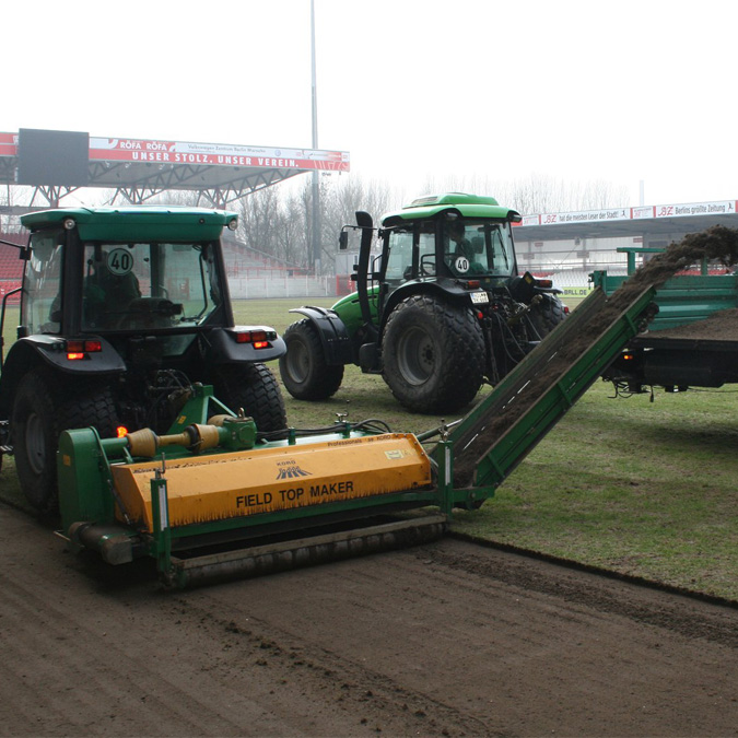 Nachdem am Wochenende die technischen Vorbereitungen getroffen worden waren, begann am heutigen Vormittag die Firma Eurogreen planmäßig mit dem Abschälen des alten Spielfeldes. Bahn um Bahn verschwindet derzeit das Gemisch aus Sand und Grasresten aus dem Stadion und wird direkt abtransportiert.