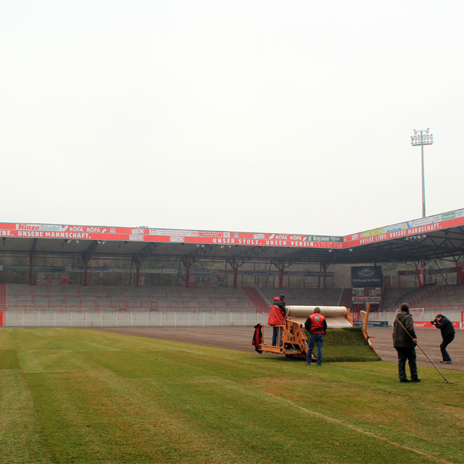 Die zweitägigen Vorbereitungsarbeiten wurden pünktlich beendet und das Wetter spielte auch mit es konnte also wie geplant losgehen. Seit dem frühen Morgen wird nun Rolle für Rolle frisches Grün im Stadion An der Alten Försterei verlegt. Knapp die Hälfte ist bereits geschafft und noch wird gearbeitet. Die nächste Fuhre der 2,20 m breiten Soden wird derzeit in Bayern transportfertig gemacht und ist pünktlich morgen früh da.