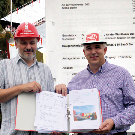 Am heutigen Nachmittag war es soweit: die Baugenehmigung für die neue Haupttribüne des Stadions An der Alten Försterei konnte im Bezirksamt Treptow-Köpenick in Empfang genommen werden. „Wir haben dieses Projekt acht Jahre lang vorbereitet. Das ist ein sehr schöner Moment“, freute sich Dirk Zingler, Präsident des 1. FC Union Berlin. Dirk Thieme ergänzte: „Es war und ist eine gute Zusammenarbeit zwischen Union und dem Bauamt des Stadtbezirkes, dafür möchten wir uns ganz herzlich bedanken“, so der Vorstandsvorsitzende der Stadionbetriebs AG.
