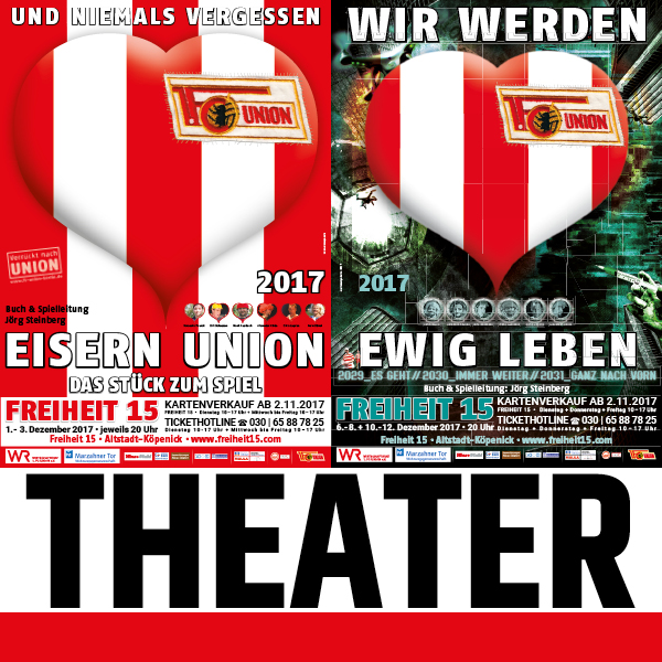 Alle Jahre wieder und mittlerweile seit 11 Jahren werden in der Freiheit 15 im Dezember im Theaterstück UND NIEMALS VERGESSEN – EISERN UNION! einige Meilensteine der Vereinsgeschichte auf die Bühnenbretter gebracht. Dieser Union-Klassiker wird in diesem Jahr vom 1. bis 3. Dezember 2017 gezeigt.