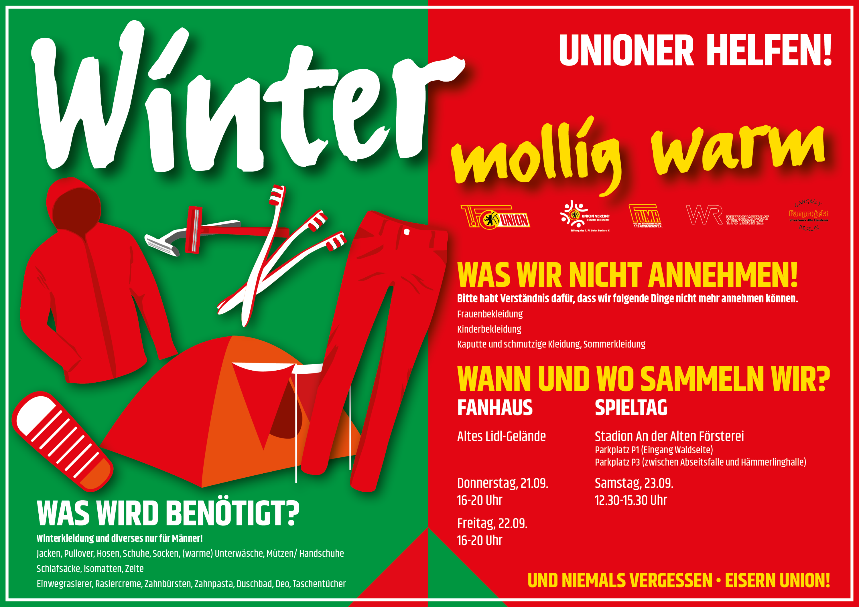Auch wenn die sommerlichen Temperaturen es aktuell nicht vermuten lassen; der nächste Winter steht bevor und so sammelt die Fan- und Mitgliederabteilung des 1. FC Union Berlin in Zusammenarbeit mit der Stiftung „UNION VEREINT. Schulter an Schulter“ und dem Wirtschaftsrat 1. FC Union e.V. wieder Sachspenden für Obdachlose und Bedürftige.